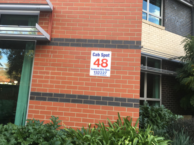 Whether you own a business, work for an organisation or are a member of the public, we are here to help you improve access to taxis at your location. CabSpot signs are installed at private business addresses with difficult booking locations, such as venues with multiple entrances that cause confusion for passengers and taxi drivers. For example, a shopping centre could utilise CabSpots to identify multiple entrances using different identifying numbers. The CabSpot sign is fixed to a building wall, or similar prominent place belonging to the business, which is in easy sight of an arriving taxi.